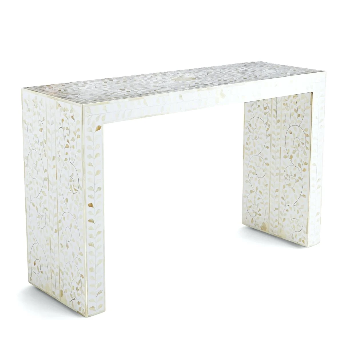 Classy and charming, this white bone inlay console with a floral pattern is the ideal platform for you to place some family photographs & scented candles on.