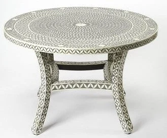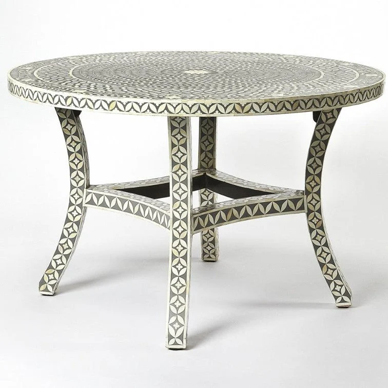 This bone inlay round dining table is perfect to be used as a 4 seater. It is compact & beautiful with a geometric pattern set in grey resin.