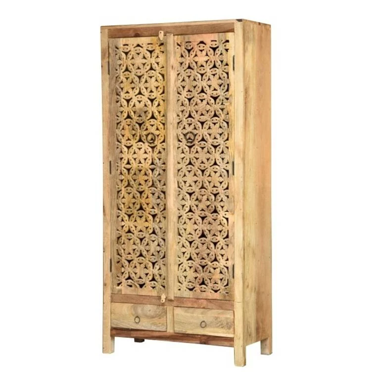 A shoe cabinet as pretty as your shoes itself! This shoe cabinet is perfect to hold your shoes on it’s 6 shelves  & all your extras in the 2 drawers. It’s comes in a natural finish with hand carved Jali  all over the doors. Size –  L 90 * W 40 * H 190 cms Material – Mango Wood Finish – Natural **Currently out of stock, available on custom order – Lead time 12 – 16 weeks Products Care – Wipe up spills immediately with a soft cloth. Avoid using cleaning products as they may damage the finish or surface. This piece is intended for indoor use. “We do customization as per your color, size and pattern. For special order, please contact us via mail.” *Note – Please note that the size and color of the product may vary slightly as this is a handcrafted unit.