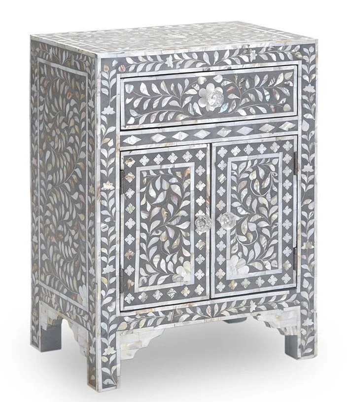 Our Mother of pearl inlay bed side tables not only look gorgeous but are super practical too! They have a drawer on top for your absolute bed time essentials and a bigger compartment with two doors below the drawer to hold other items.