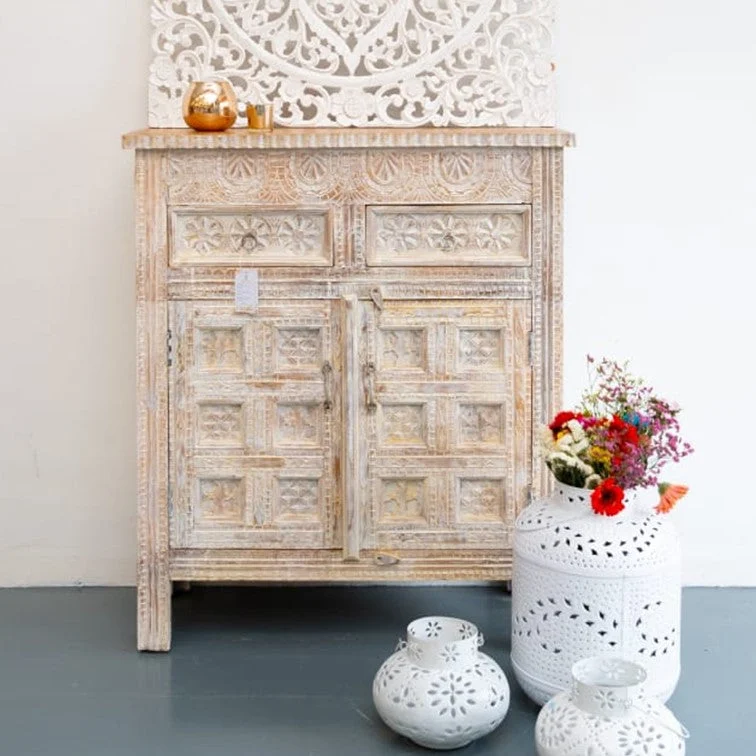 This gorgeous chest will provide you with ample space for all your extra things while adding to the beauty of your room! The entire front panel is hand carved and comes with complimenting metal pulls. You can use the top of the cabinet to display your favourite photos and candles!