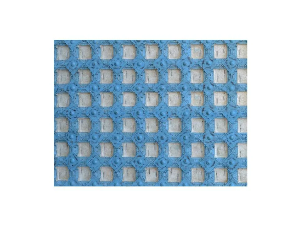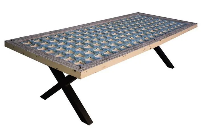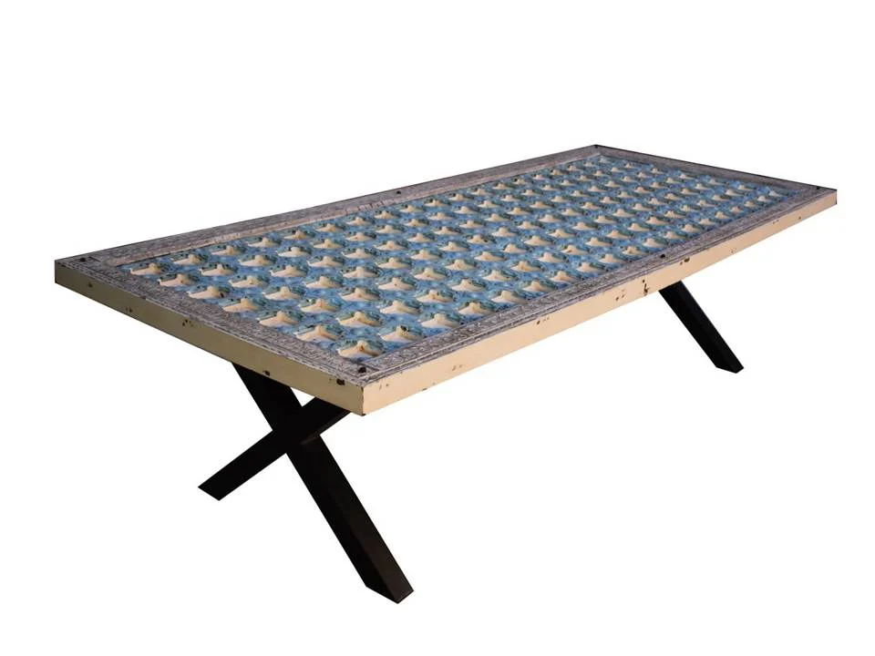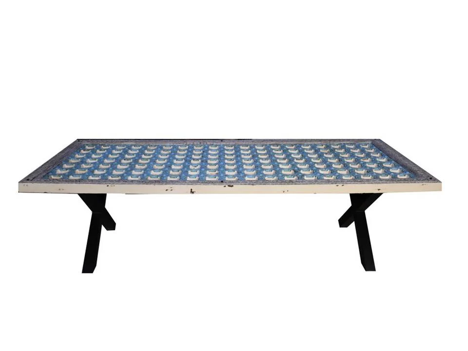 Converted from a door, the Larry Dining Table has a beautiful blue & white washed finish with iron legs and a glass top to complete the piece!