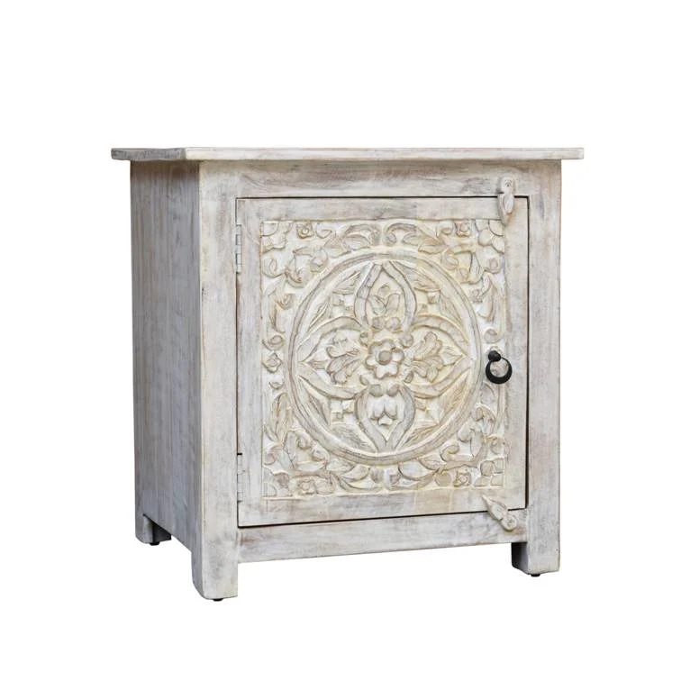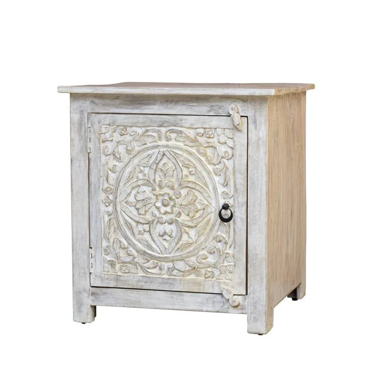 This bedside cabinet comes with one door, which is fully hand carved in floral designs & offer you great storage.