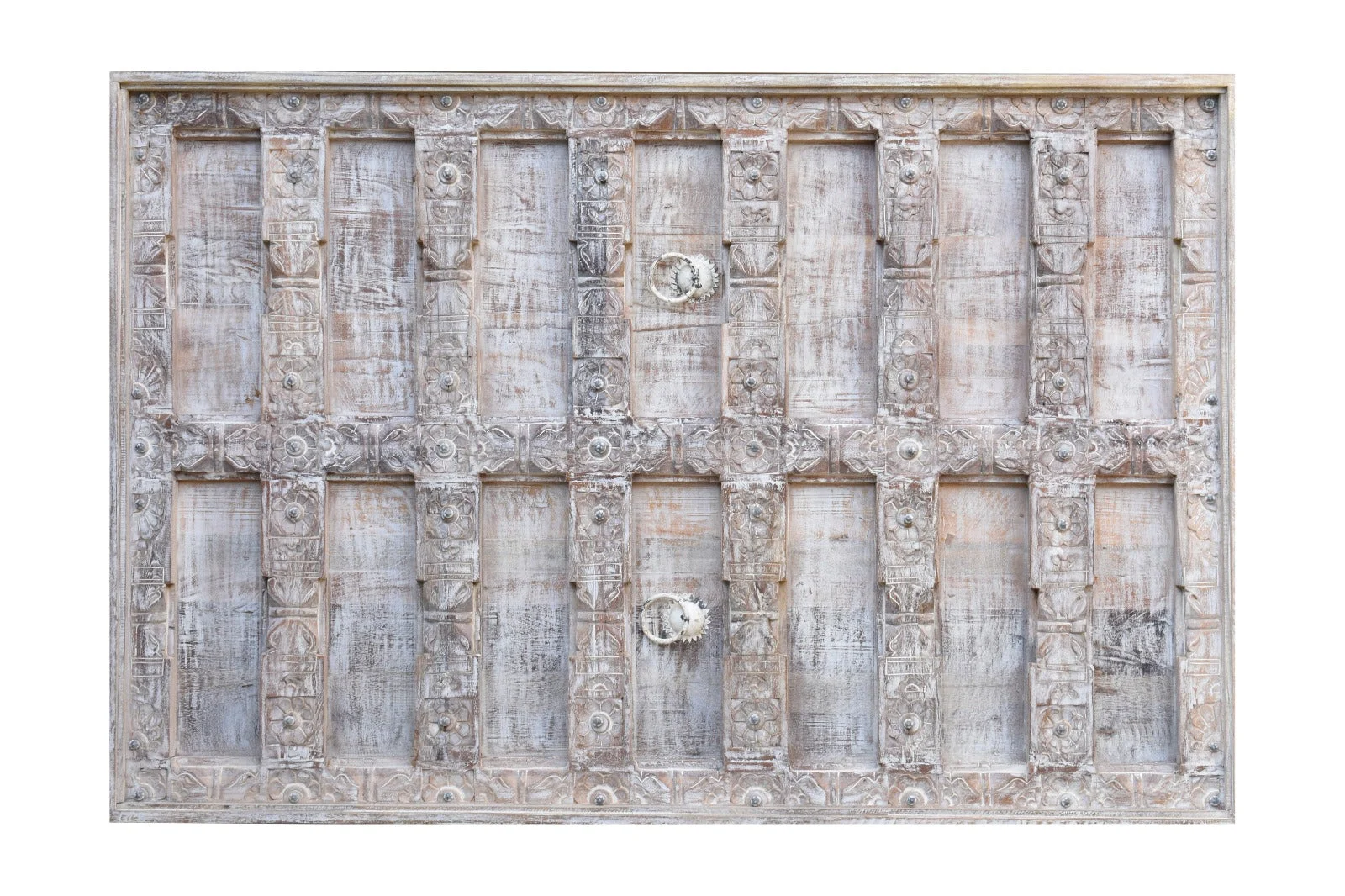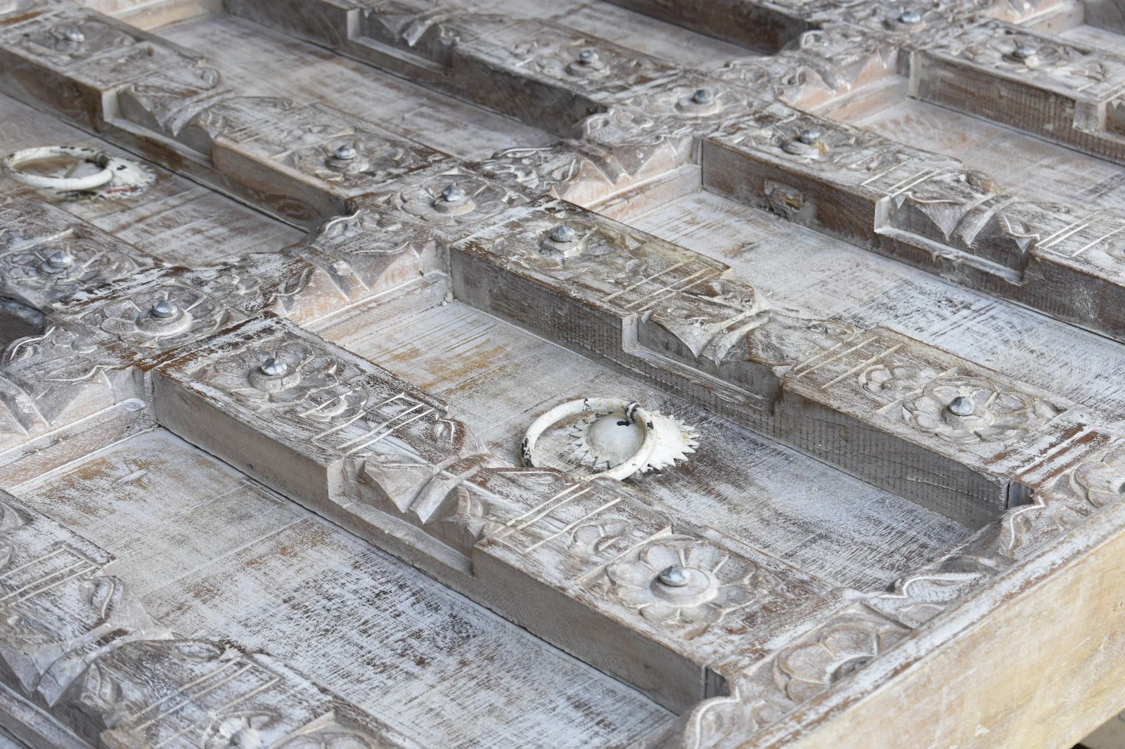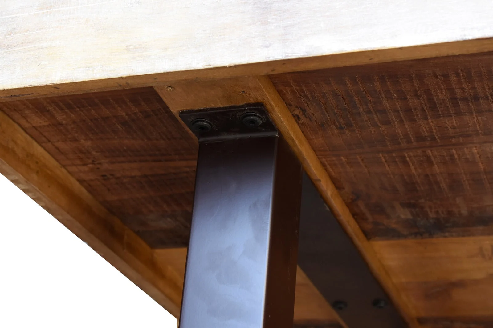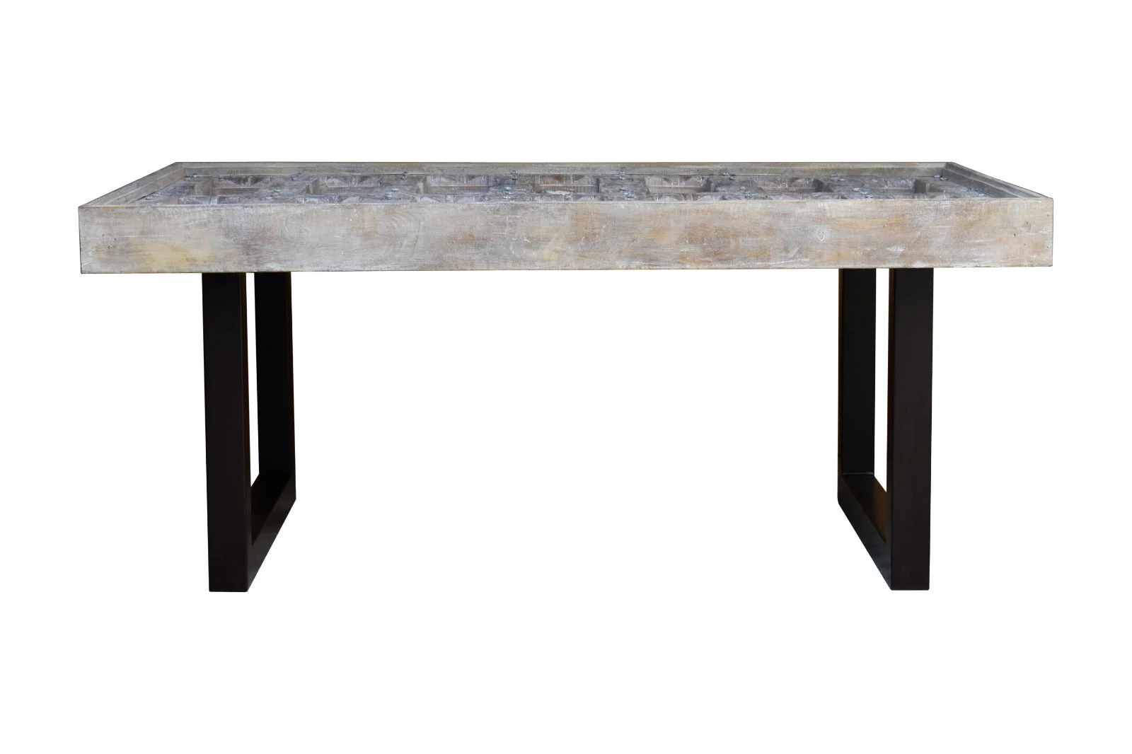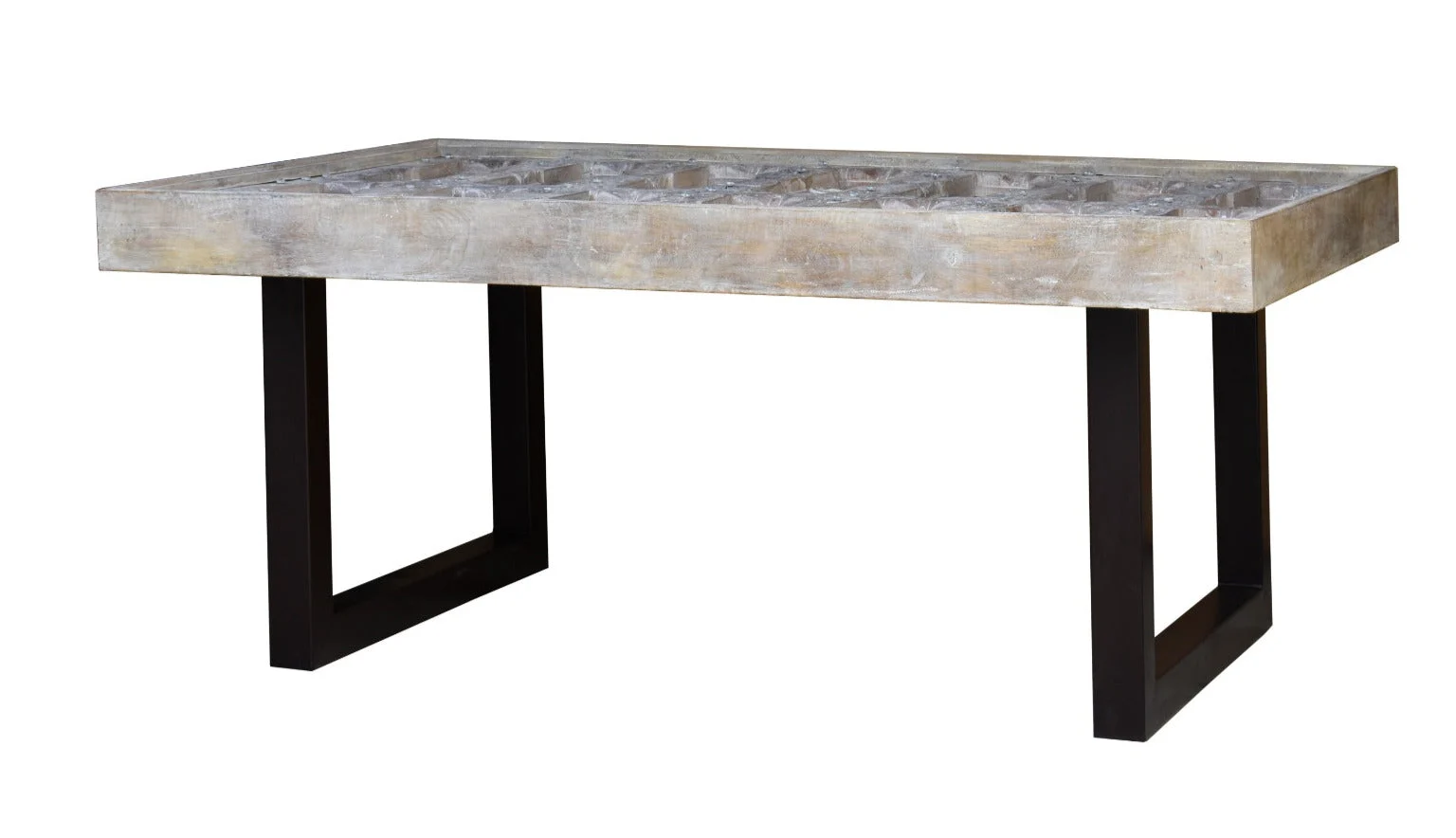 The Shan Dining Table is finished in a white wash style with a glass on top.